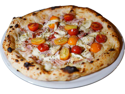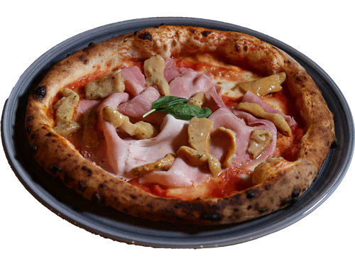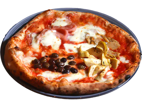 Mutti tomato sauce, fior di latte, ham, natural artichokes, porcini mushroom, taggiasche olives “Anfosso” Liguria.