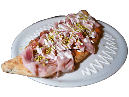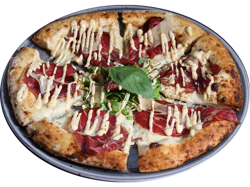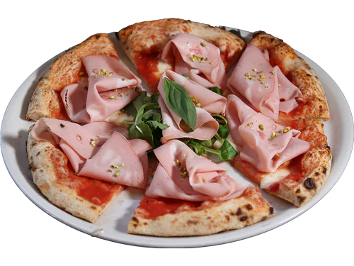 Mutti tomato sauce, fior di latte cheese, boar mortadella with truffle, chopped pistachios.