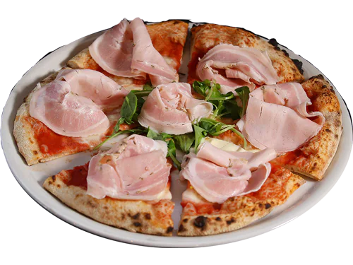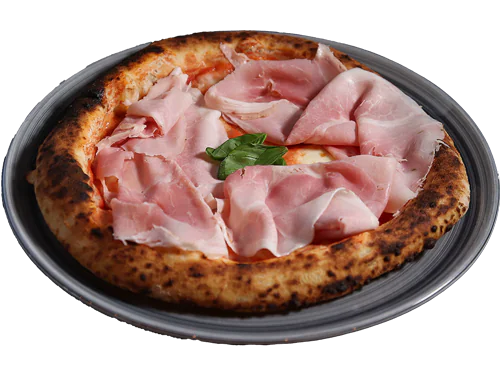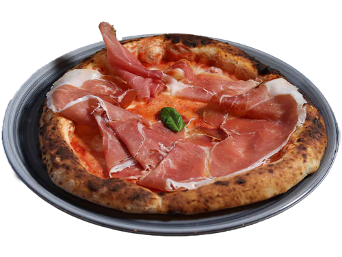 Mutti tomato sauce, fior di latte cheese, Parma ham matured for 24 months, basil, extravergine olive oil.