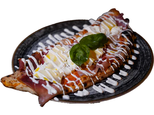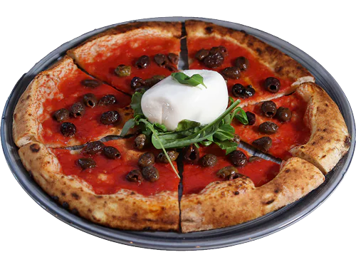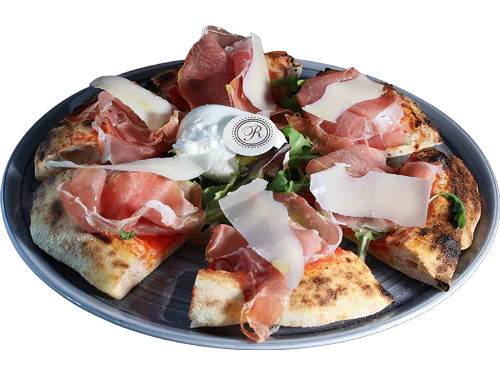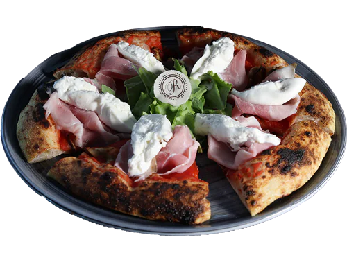 FUORI: Salsa di pomodoro Mutti, prosciutto crudo Parma, stracciatella di burrata e scaglie di grana.