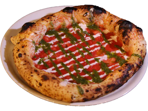 Mutti tomato sauce, Stracciatella burrata cream and fresh basil pesto.